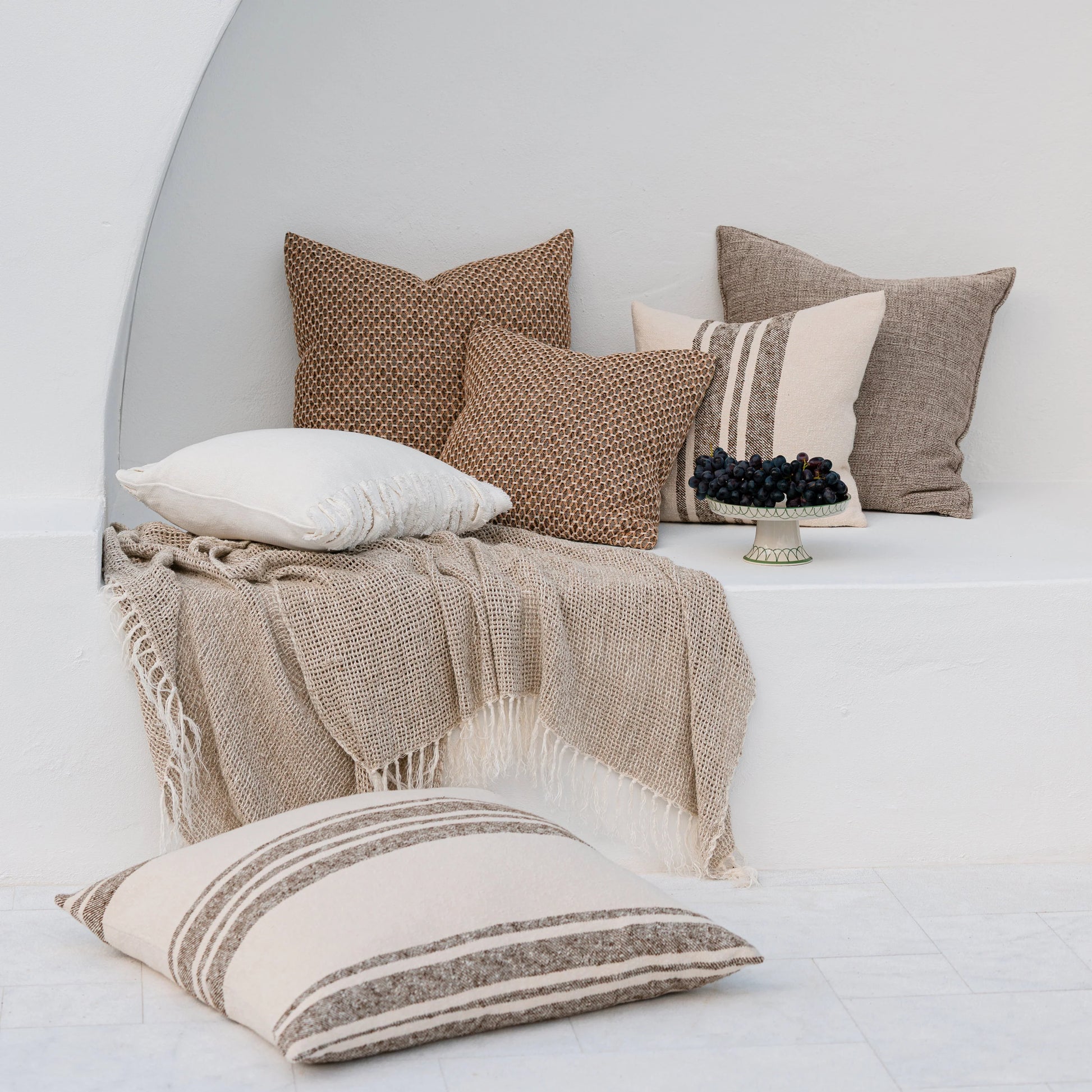 Handwoven from a lightweight linen-cotton blend, Solenne features a netted weave in natural and ivory yarns that enhances its organic character. Finished with hand-tied fringes on each side.