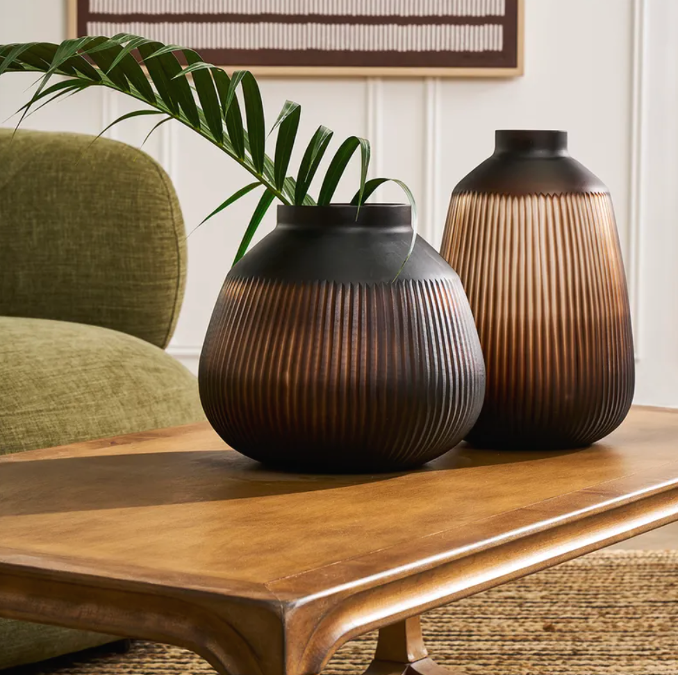Crafted with a matte finish and ribbed texture, its subtle gradient from deep brown to soft taupe exudes a warm, sophisticated charm. Perfect for modern or classic decor, this vase adds a touch of understated luxury to any space. Its versatile design makes it ideal for displaying flowers or as a standalone statement piece.
