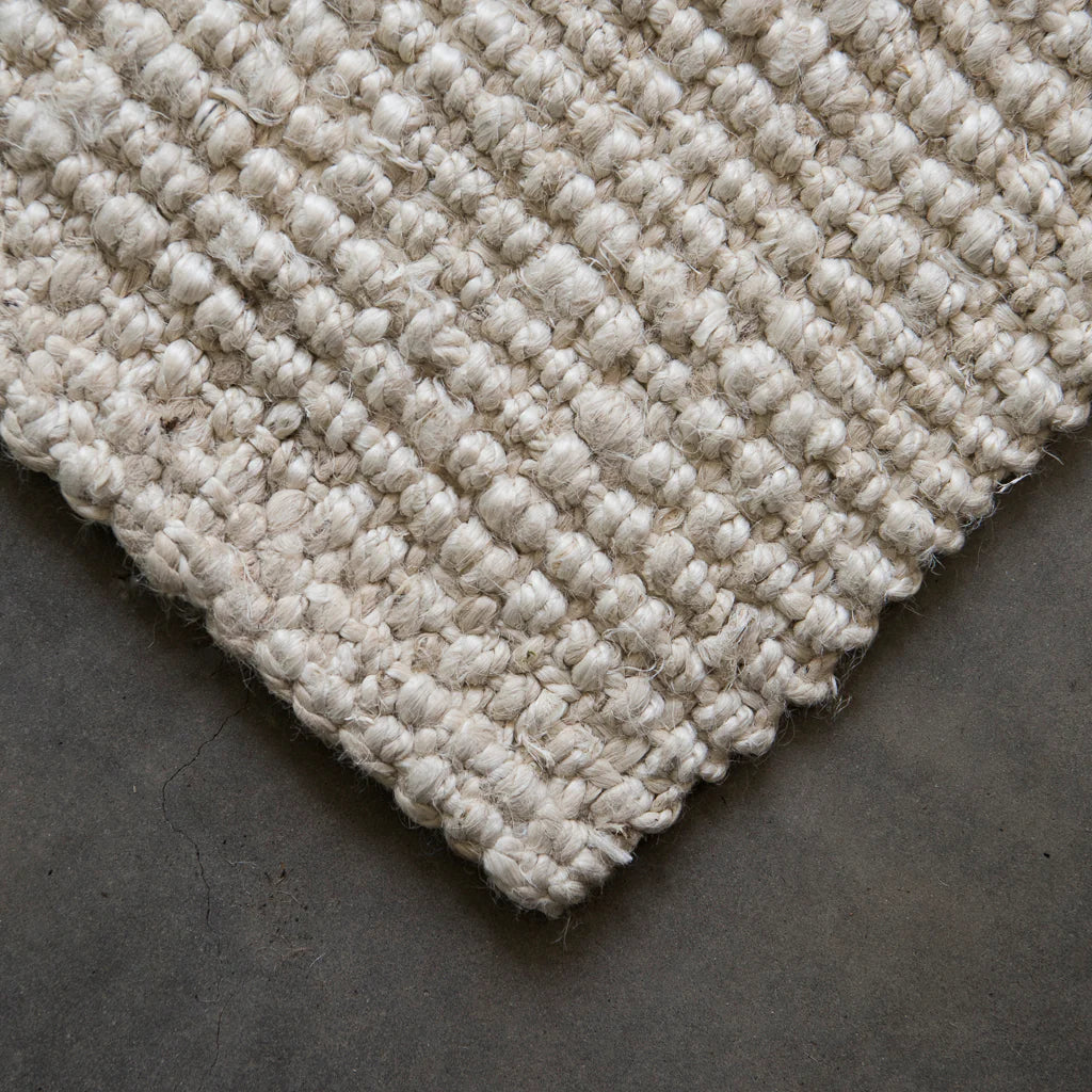 Boucle is a thick chunky weave designed to provide durability and practicality to high traffic areas whilst being comfortable and soft underfoot. Use it as a hallway runner rug to create an inviting entrance or as a kitchen runner rug for comfort while cooking. Each rug is handmade, meaning no two are the same. Irregularities are characteristic of the design and process, and are considered a feature of the product.